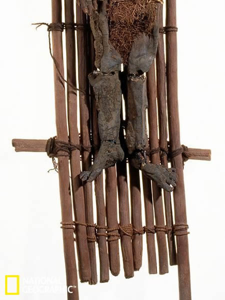 在新克罗人中,有些小孩的木乃伊会被绑在木头框架上放置在他们家长的背后。上图是一个大图中的一个部分,一个大约5000年前的儿童木乃伊的四肢被完整地保留下来。研究团队猜测新克罗人在大约7000年前经历的一个降雨期促成了其高度发展的文明,同时也让他们的工艺得到了进步。大约4000年前,因为厄尔尼诺现象的发生让气候变得干燥,也让这个文明慢慢走向衰退。严酷的自然环境无法支撑起庞大的人口,很多活动也相应地停止。