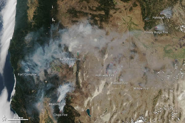 在利福尼亚州北部,三起大型野火烧毁了大片针叶林:拉森火山国家公园的雷丁大火(Reading fire),普卢默斯国家森林的奇普斯大火(Chips fire),克拉马斯国家森林的康姆普莱克斯堡大火(Fort Complex),其中最大的是奇普斯大火。