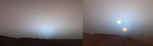 所谓的火星双日落照片,这是一张仅仅经过简单伪造的假图,但是却迷惑了无数网民,这里的左栏是2005年由好奇号火星车拍摄的原图,右栏则是伪造的假图