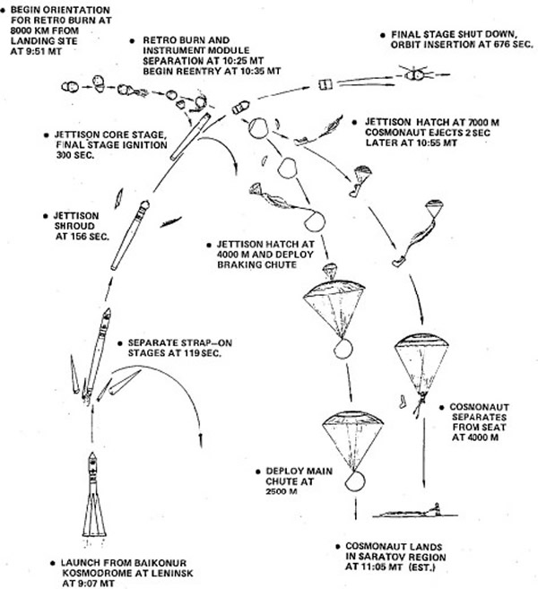 苏联“东方”系列宇宙飞船宇航员返回舱降落示意图