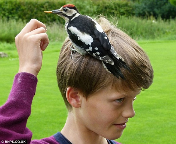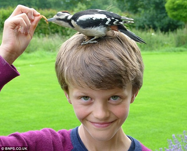 近日,一名11岁的英国男孩亚瑟在自家花园里发现了一只跌出巢的小啄木鸟,将它收养。在他们一家的照顾下,小啄木鸟茁壮成长,而且还学会了听亚瑟发出的命令。只要亚瑟呼唤它的名字,小啄木鸟就会飞到他头上,等待喂食。