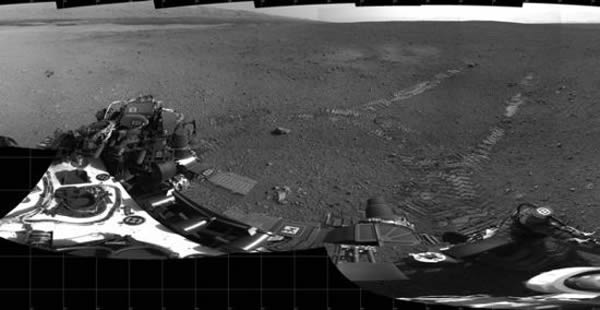 这一360度全景照片展示了好奇号首次测试行驶的情况。2012年8月22日,好奇号首次尝试行驶,在此过程中好奇号向前行进了4.5米,转动120度,随后退后大约2.5米。目前好奇号已经离开它的着陆点大约6米。它的着陆点已经被命名为“雷·布莱伯利”