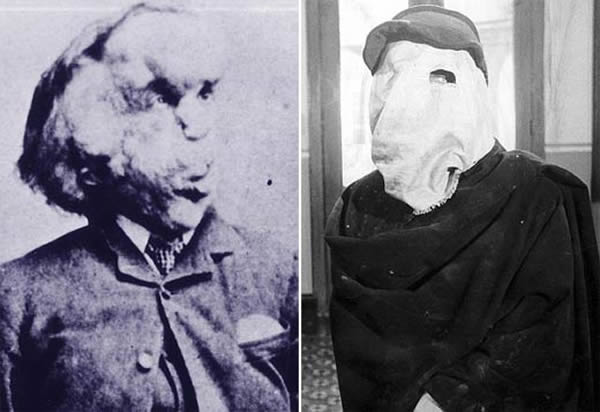 图:左:患有先天性严重畸形的梅里克。右:1980年,电影《大象人》中的梅里克由约翰·赫特扮演