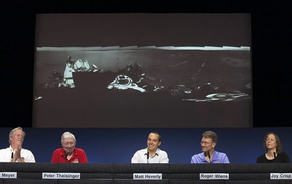 在美国帕萨迪娜市的喷气推进实验室,美国宇航局的科学家公布了好奇号火星车一张全景图像,显示了该火星车首次行驶路径痕迹。