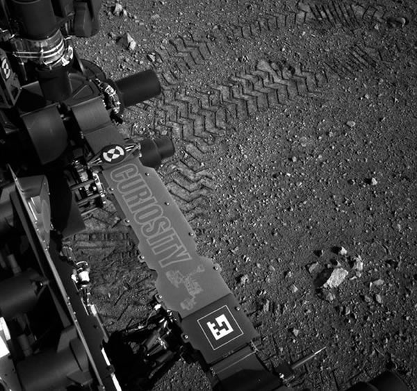 这是美国宇航局最新公布的图像,显示好奇号首次测试行驶,火星车右侧可清晰地看到摄像机
