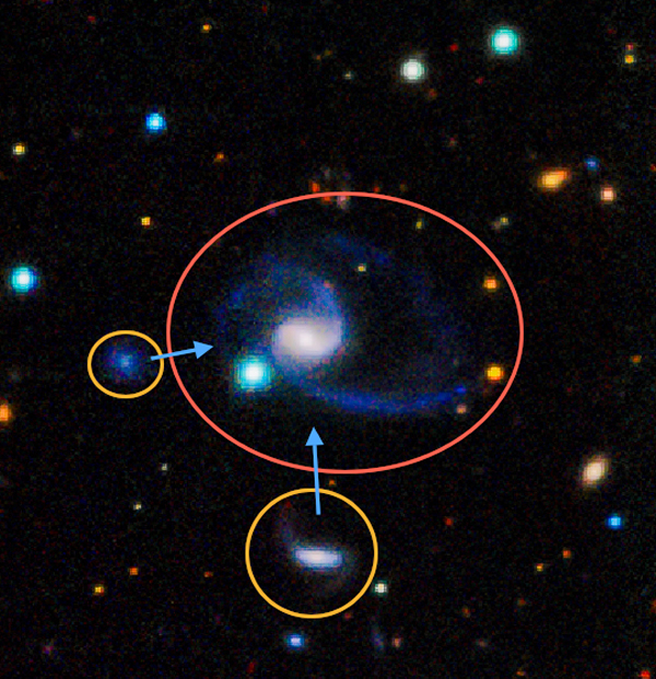 近日发现的两个“精确匹配”银河系的星系之一。较大的星系名为GAMA202627,清晰的显示了有两个较大伴星(图左下方)。图片中更蓝颜色代表更热更年轻的恒星。