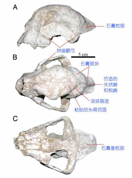 “柯氏猎豹”头骨上造假部分的标注。(邓涛提供)