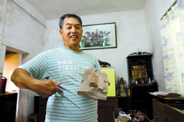 昨日下午,阳光照进三水张边市场附近的一间民居,房内墙上挂着一幅“三水盆地基岩地质图”,粗略标记恐龙、鱼类、鸟类等化石的分布,52岁的赵灿辉看着地图说:“三水盆地我基本走遍。”由于长年在外“寻宝”,他的皮肤被晒成了古铜色。