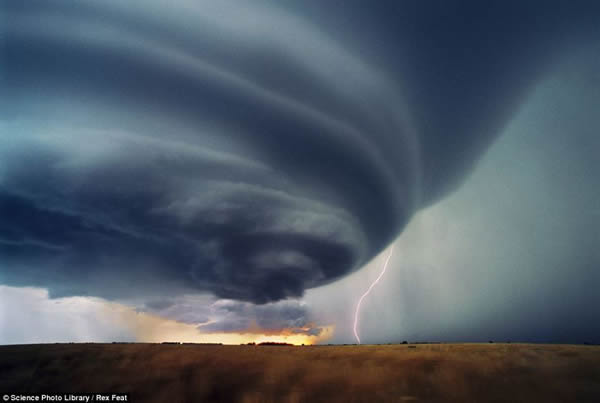 它是在极不稳定天气下由空气强烈对流运动而产生的一种伴随着高速旋转的漏斗状云柱的强风涡旋。其中心附近风速可达100m/s~200m/s,最大300m/s,比台风近中心最大风速大好几倍。龙卷风的破坏性极强,其经过的地方,常会发生拔起大树、掀翻车辆、摧毁建筑物等现象,甚至把人吸走。