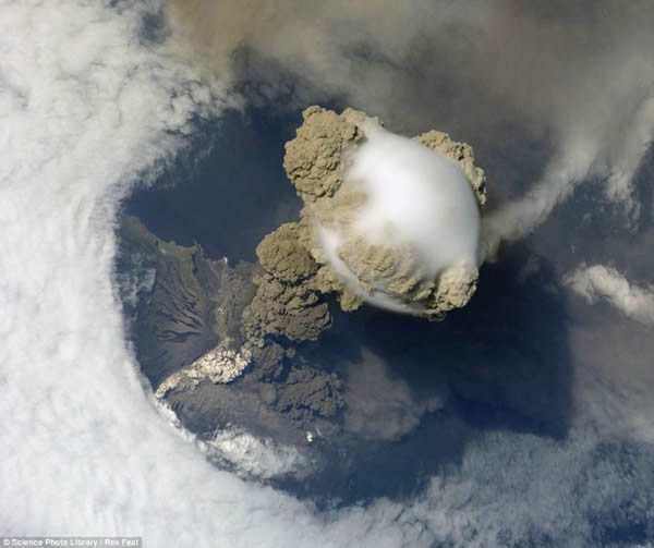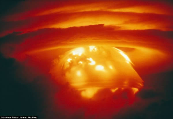 本图反映的是1956年8月21日的一次氢弹试验。它是核弹爆炸后产生的大量低压热气向上运动产生的。蘑菇云内携带的放射性尘埃和核爆一样,对人来说都是致命的。