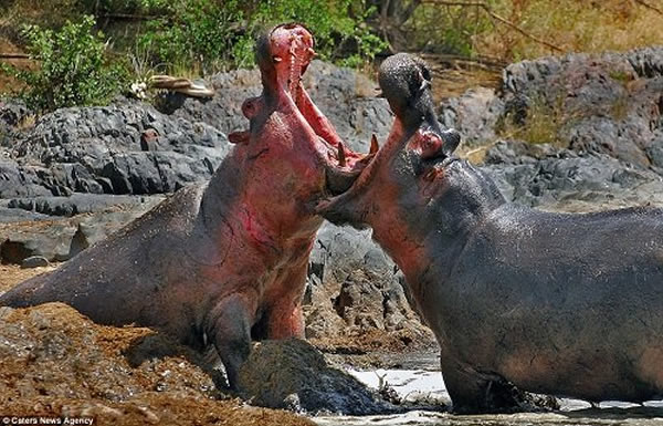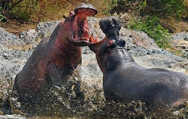 业余摄影师阿列克谢(Alexey Tishchenko)在纳米比亚草原上拍到这一场景。他说,当时这两只河马为了争夺领地,在河中撕咬起来。阿列克谢说,这两只河马的打斗十分激烈,皮肤也因为激动和愤怒而泛红。