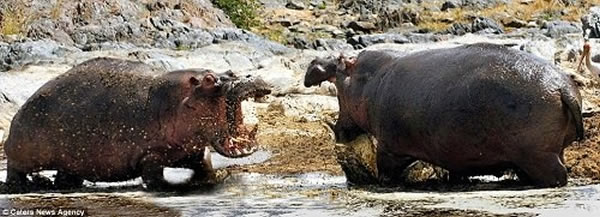 由于此时非洲处于旱季,河马经常为争夺水源和地盘而战