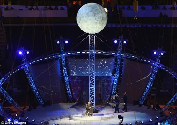 随着一个炽热的火球从天而降,霍金教授的电脑合成声音响彻整个伦敦碗,向现场观众发表演讲。霍金是人类战胜磨难和不幸的一个最具标志性的人物,当时,他坐着轮椅出现在舞台上。他在演讲中恳求全世界的人们“仰望星辰,而不是始终盯着自己的脚”。