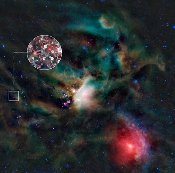 在银河系中部天区的宽广宇宙空间中,IRAS 16293-2422恒星存在于暗色的蛇夫座(rho Ophiuchi)恒星形成区中,其距离我们大约400光年。星际气体和尘埃在不断聚拢坍缩形成婴儿恒星,其周围宇宙空间环境是极度寒冷的,许多气体凝固形成类似冰状的物质附着于尘埃粒子上,然后这些分子互相粘合,最后形成了更加复杂的分子。一旦恒星形成后并以中等速率进行旋转,就会带动周围的气体和尘埃,而且会加热内侧的尘埃云,这样在温度较高的空间环境下将形成复杂的化学分子。我们通过强大的射电望远镜,比如欧洲南方天文台阿塔卡马大毫米波/次毫米波阵列,可以探测到该过程中释放出的射电信号。