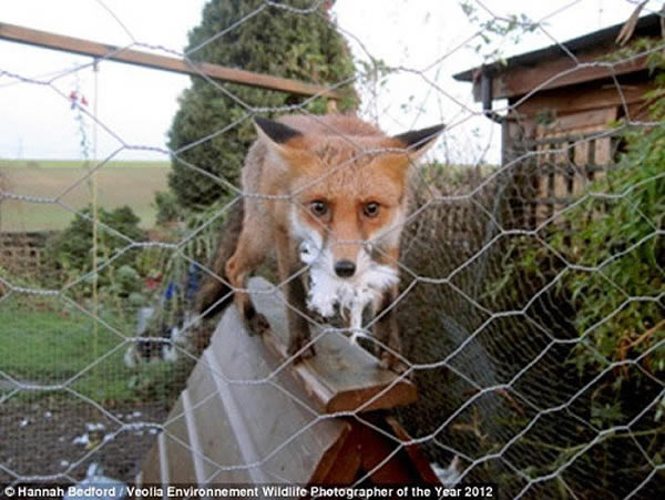 今年11岁的英国女孩汉娜(Hannah Bedford)家中饲养了4只母鸡。一天早晨,她准备上学时,突然发现家中的鸡舍上站着一只动物。她起初以为是只狗,但细看,竟然是一只满嘴鸡毛的狐狸。汉娜立刻抓起相机,拍下了这只偷鸡的狐狸。