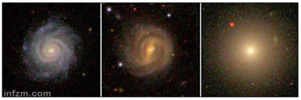 从左往右分别是:正常的蓝色旋涡星系,红色旋涡星系,椭圆星系