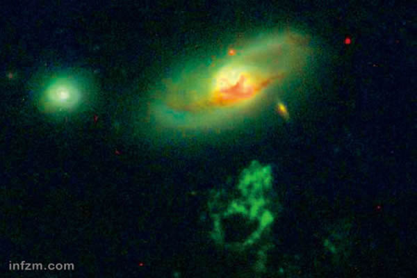 涵妮·凡·阿克尔(Hanny van Arkel)之所以会加入“星系动物园”的志愿者行列,是受到了偶像的感染。她的偶像布里安·梅(Brian May)既是著名的吉他手又是天体物理学家,在梅的感召之下,阿克尔很快就投入到星系分类的工作中并为之着迷。有一天,她在查看星系照片时注意到某个星系的旁边有一团绿色的云状物体,她很好奇那是什么东西,于是在论坛上发了一个帖子询问。结果,没有人知道那是什么——包括专业的天文学家在内。