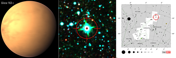 福韦耶和他的同事是在用智利的一架望远镜搜寻该行星的主星的摆动情况时发现它的。天文学家计算发现,这颗名为GI 163c的行星所获得的能量比地球从太阳获得的能量多30%到40%。由于不知道这颗行星的半径,因而尚不清楚其构成物质,但科学家推测应该是岩石和水的混合物。