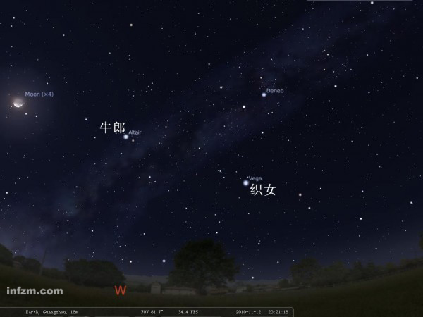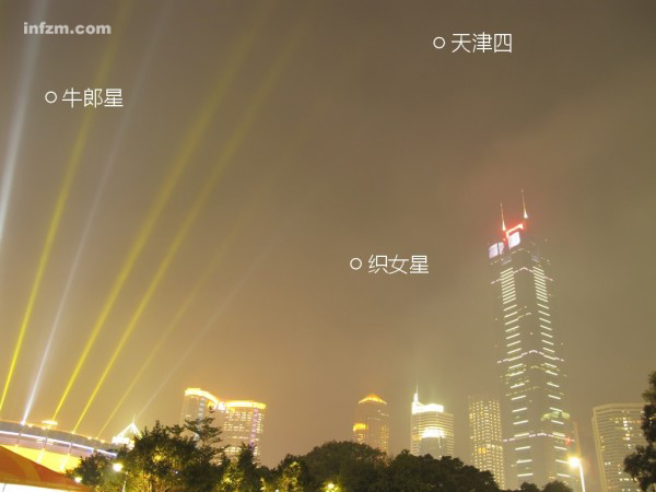 地球上的任何地点在没有光污染的情况下可以看到大约3000颗星(当然要天气晴好且无遮挡)。你可以回忆一下在城市里能数到多少颗…… 这是我吃完晚饭看到天气好的时候偶尔会干的事情。通常情况下,城市里的景象是如何的呢?可以看看这张亚运前夕在广州市中心拍的照片。一直好奇牛郎织女在哪里的朋友,可以趴在图上找找看,虽然对我来说要原图、原尺寸来看才能看到它们的倩影—— 注意这可是全天第五亮恒星织女星哦。为了证明我并不是在图上随便画几个圈就说织女星在那,顺便附上当时的星图。银河就正打两颗星之间穿过呢。
