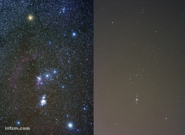 或许你会说大概当天天气不好吧。实际上,灰蒙蒙的天空又和前段时间大出风头的PM2.5挂上了关系。PM2.5反射了地面的光线,使得原本就明亮的天空显得更为明亮了。同一个地点向另一个角度拍摄的照片里,我们还能看到惨兮兮的半轮月亮,背景是人马座(射手座)和摩羯座(山羊座)。前者可是南方夏季星空的标志星座之一,古人称南斗(记得“北斗阑干南斗斜”吗),当然也完全被城市灯光所掩盖。粗略估计,当晚的光污染亮度接近背景夜天光亮度的1000倍。