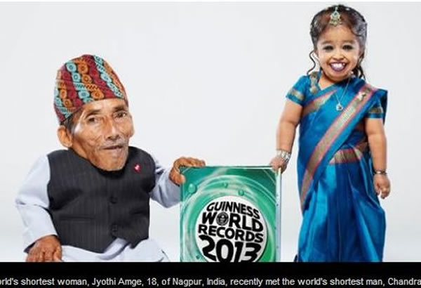 据英国《每日邮报》8月30日报道,为了迎接第57版《吉尼斯世界纪录》问世,世界上最矮的男女——钱德拉·巴哈杜尔·唐吉和乔蒂·阿玛琪近日首次在意大利见面。