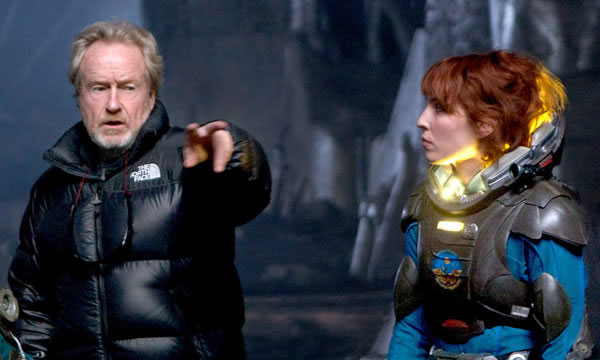 导演雷德利·斯科特与劳米·拉佩斯在《普罗米修斯》的拍摄现场。