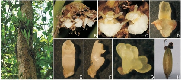 A. Plant; B. Inflorescences; C. Flower; D. Lip; E. Frontal column; F. Lateral column; G. Pollinia; H. Fruit
