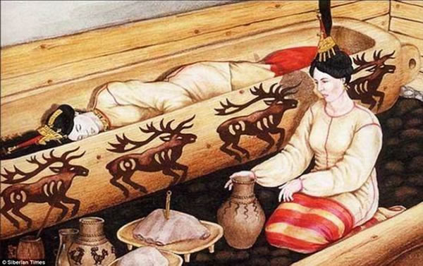 在西伯利亚阿尔泰山脉挖掘发现的神秘公主尸体,图为艺术家描绘的入葬时情景,死者和仆人身穿巴泽雷克传统服装,棺材上还雕刻着驯鹿的图案