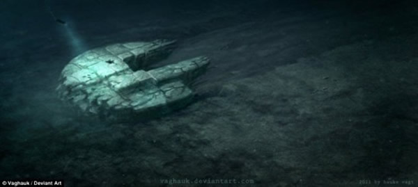 画家瓦格胡克创作的艺术概念图,刊登在deviantart.com网站,展示了波罗的海海底的神秘物体。布鲁切特教授表示希望能够听到比较理性的观点,“Ocean-X潜水队并没有意识到,他们在海底采集的绝大多数样本都是花岗岩、片麻岩和沙岩。”
