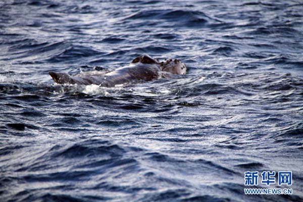 一只鲸鱼在马达加斯加东部圣玛莉岛附近海域嬉戏