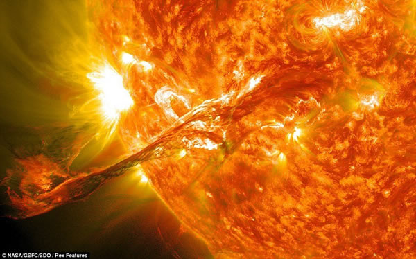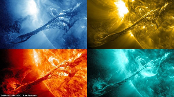 这些照片是由美国宇航局太阳动力学天文台(SDO)拍摄的,图像显示鞭状太阳暗条在太阳表面形成一个较大的弧状结构。该日冕物质喷发(CME)的速度达到每秒900英里。