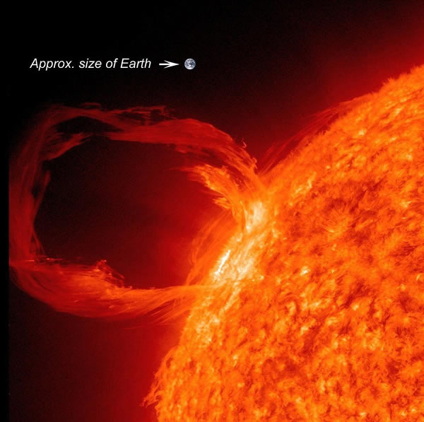 该图是之前太阳表面出现的暗条结构,图片背景是与太阳暗条相对比大小的真实地球