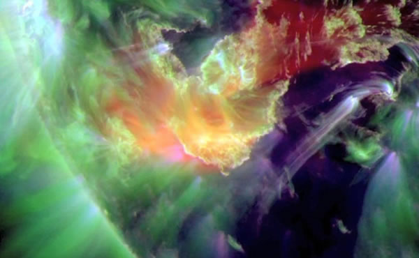 在四种不同超紫外线波长下,2012年8月31日出现的日冕物质抛射,它将导致地面电力系统中断,但在9月3日晚上地球出现美丽的极光现象