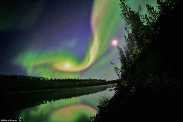受太阳表面超级喷射影响,2012年9月3日加拿大怀特霍斯市上空出现红绿色旋涡状的北极光