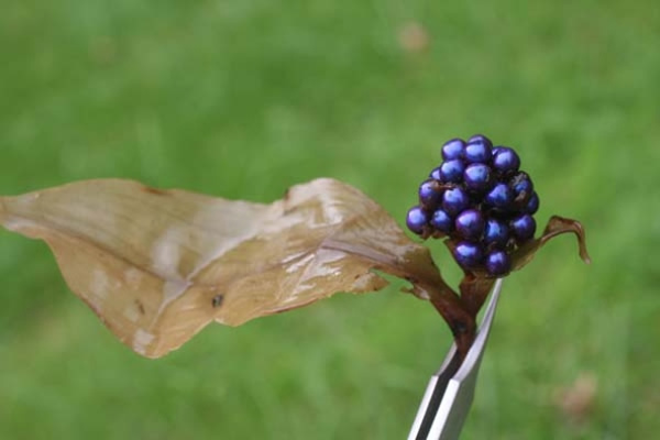 Silvia Vignolini及其同事研究了来自一种杜若属植物(Pollia condensata)的果实,这是一种从埃塞俄比亚到安哥拉和莫桑比克都有生长的物种。他们的光学和结构研究表明这种果实没有蓝色色素,而是通过纳米尺寸的结构与光的相互作用产生了它的颜色,这种结构是微小纤维状的纤维素丝,在这种果实的表皮细胞壁内部堆叠成螺旋层。
