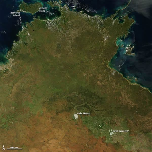 2012年4月3日,澳大利亚北领地普遍天气晴朗、阳光灿烂,NASA的Terra卫星得以拍下了该地区的清晰照片,直观地展示了该地区从内陆到沿海的地貌变化。