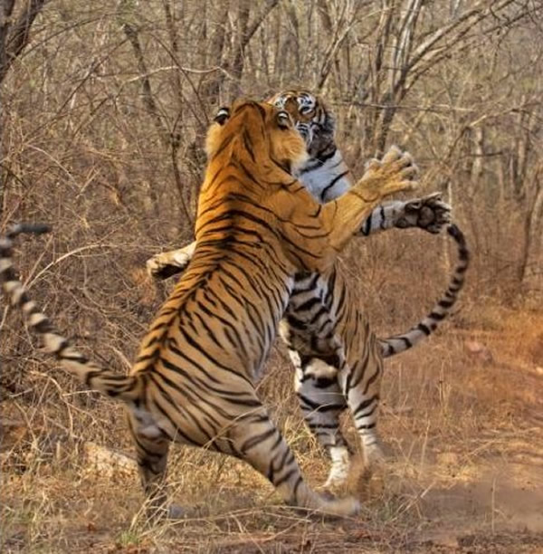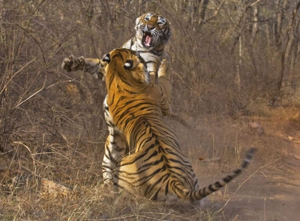 野生动物摄影师迪赫里提曼-穆克吉在印度拉贾斯坦邦兰泰姆霍尔国家公园用相机拍下这个惊人瞬间。这位37岁摄影师说:“那天这只雄虎进入这只上了年纪的雌虎的领地,偷走雌虎在早上捕获的猎物。但当时什么也没发生。到了晚上我预计会有事发生,于是来到同一地点,发现雌虎和雄虎在路的两边休息。”