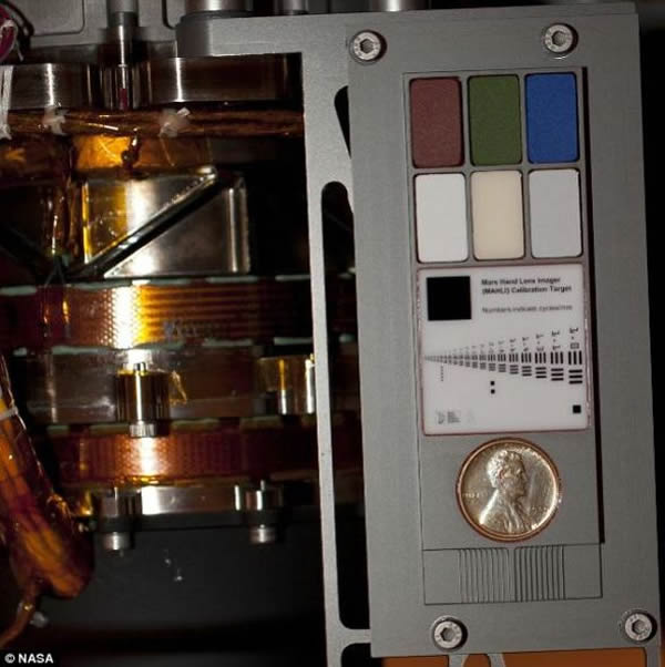 这枚硬币粘贴在“好奇”号火星车上,帮助它校准高科技相机