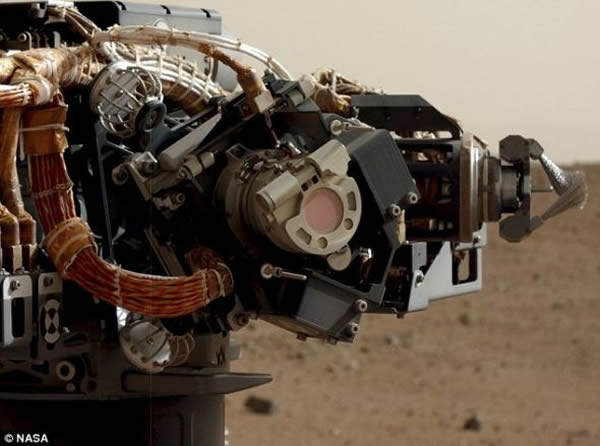 在火星表面拍摄的这张照片,展现了火星手持透镜成像仪(MAHLI)相机的外观