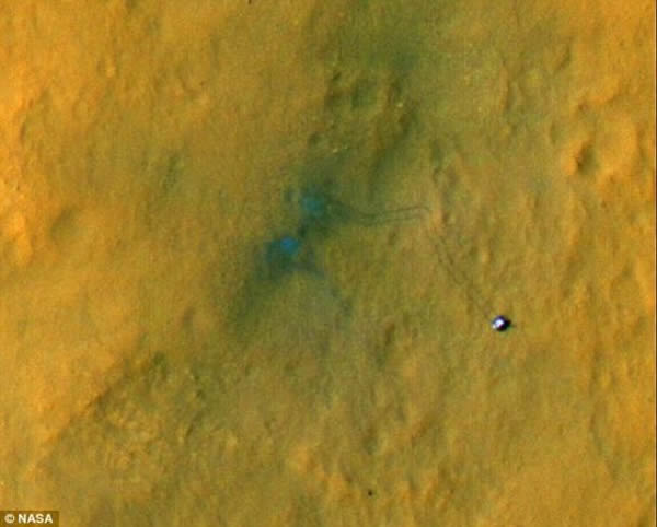 其他最新图片还显示了把“好奇”号送上火星的设备的最终安息地。这辆高科技火星车以每小时1.3万英里(2.09万公里)的速度进入火星大气层,然后借助飘浮在空中的“天空起重机”缓慢下降,最终成功在一个巨大的陨石坑里着陆。现在操作员已经拍摄了天空起重机最终登陆点的彩照,并已发现用来降落的降落伞和护板,由于“好奇”号的降落过程非常复杂,因此它又被戏称为“惊险七分钟”。