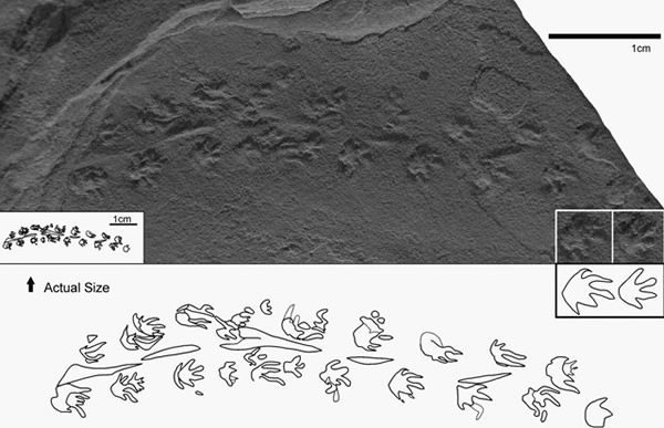 乔金斯化石断崖于2008年被列入联合国教科文组织《世界遗产名录》。此次发现的化石仅长48毫米,上面共有30余处脚印。据测量,这只两栖动物的前肢脚印长约1.6毫米,后肢脚印长约2.4毫米。研究者表示,从化石上显示的运动轨迹来看,这是一个身长约8毫米、类似蝾螈的幼年两栖类动物留下的脚印。