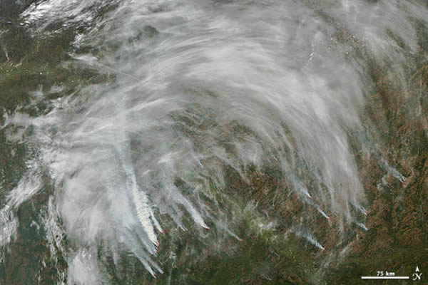 2012年9月11日,美国宇航局Aqua卫星上的中分辨率成像光谱仪(MODIS)拍下了这幅照片,显示了西伯利亚托木斯克地区的野火火灾。2012年整个夏天,托木斯克地区野火火灾不断,鄂毕河(Ob River)附近浓烟滚滚。红色的轮廓线标明了地表温度极高的地区。