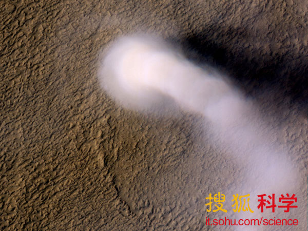美国宇航局的“火星勘测轨道飞行器”于2012年3月14日拍摄到的一个尘卷风(魔鬼旋风)。这个尘卷风的高度达到了12英里(约合20公里)。