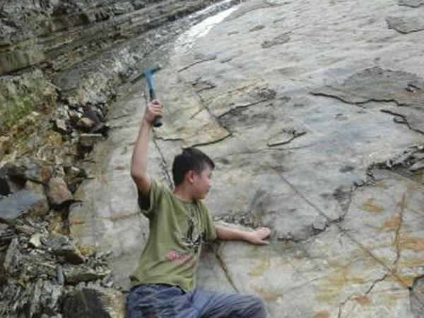 2012年7月,林子杰和父亲约上一位化石猎人来到广元,他与大人们一起攀上陡崖,很快,他们在一个岩石层位发现了大量的菊石,一块两块看得眼花,敲得手麻。可最后要下去的时候却犯了难。抱着几十斤重的化石如何下陡崖啊?敲出来的化石舍不得扔下,林子杰跟大人们一样,怀里抱了一块巨大的化石艰难地挪到崖下。