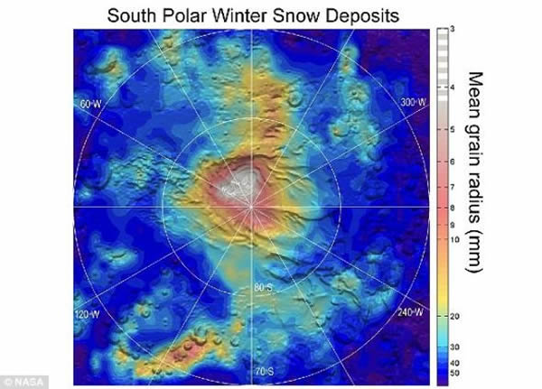 研究显示这颗红色行星遍布陨石坑的表面偶尔会经受暴风雪的袭击,不过这些“雪”的成分不是水而是干冰