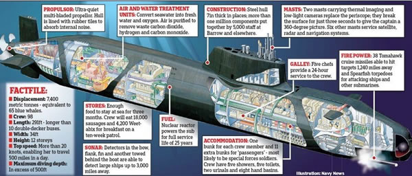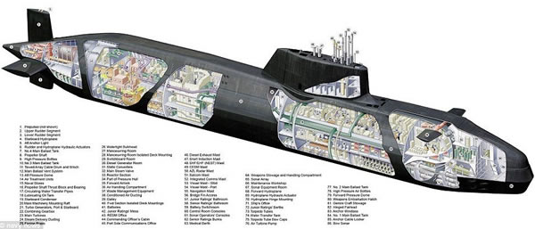 “机敏”级攻击型核潜艇是一级融合超级高科技的潜艇,并经过了严格的评估测试,配备艇员数量为103名,普通士兵为2米乘1米的双层床。从立体解析图上可以看出,“机敏”级攻击型核潜艇在有限空间中尽可能多地集成了许多复杂的技术。