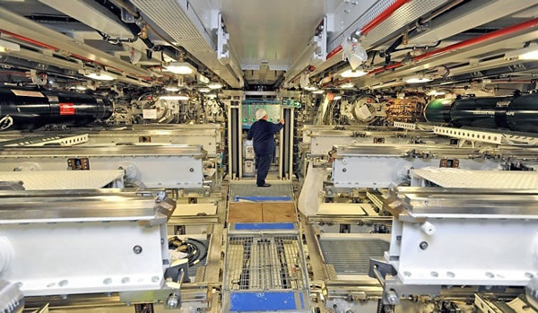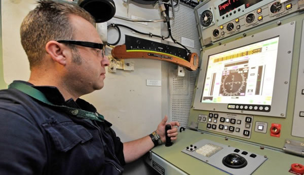 “机敏”级攻击型核潜艇伏击号的声纳系统的能力是相当令人畏惧的,相当于2000台便携式计算机的处理能力,图中的工程技术人员正在控制室中测试潜艇的转向系统。在经过一年左右的海上试验后就能加入海军服役。出于安全原因,更多关于“机敏”级攻击型核潜艇武器系统细节是无法得知的。
