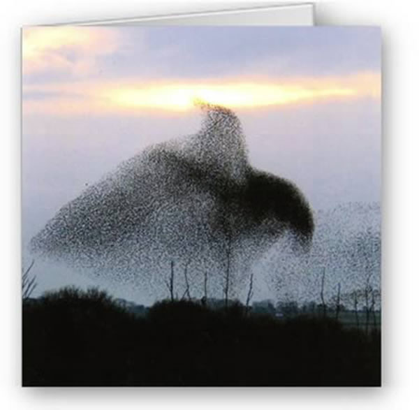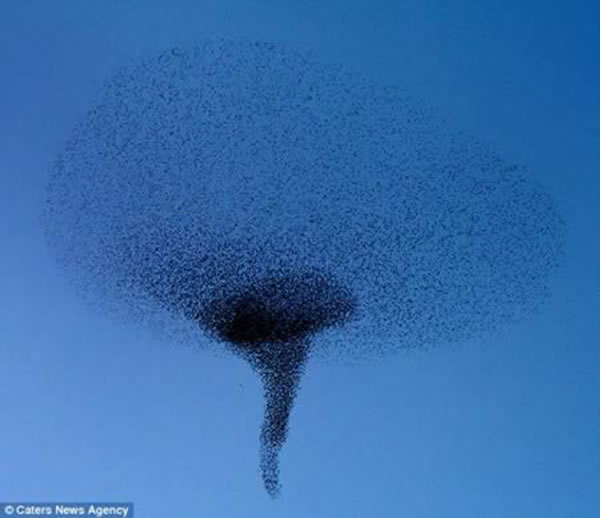 第一眼瞥见这张惊人的照片或许看起来就像一只巨鸟盘旋在空中,但是这个惊人的轮廓事实上是由一群椋鸟构成的。当它们遭受一只靠近的游隼威胁的时候就会形成这种令人难以置信的编队。一旦椋鸟发现捕食者,它们就会组合在一起模拟一只巨大的飞行生物的外貌。业余摄影师罗伯-沃斯滕霍姆是在萨摩赛特的荒地国家自然保护区抓拍到了这种令人震撼的现象。