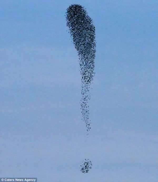 一名摄影师拍摄到5000只鸟在天空中创造出一个感叹号飞行编队的瞬间。