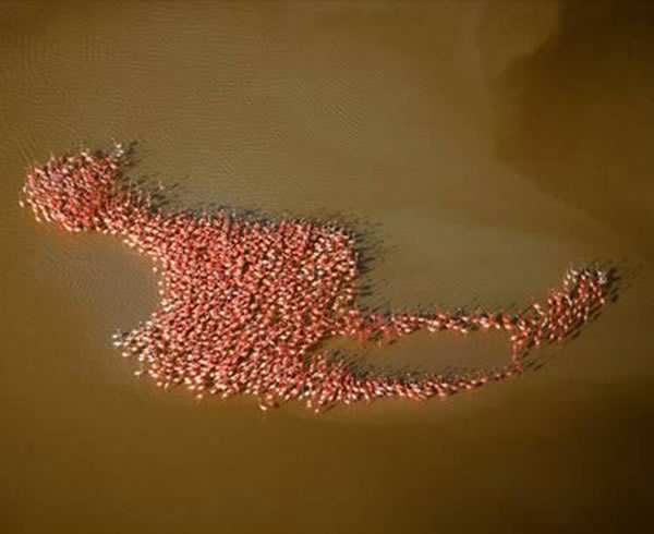火烈鸟在墨西哥尤卡坦半岛一个环礁湖的浑水中组成了一个鸟的形状。